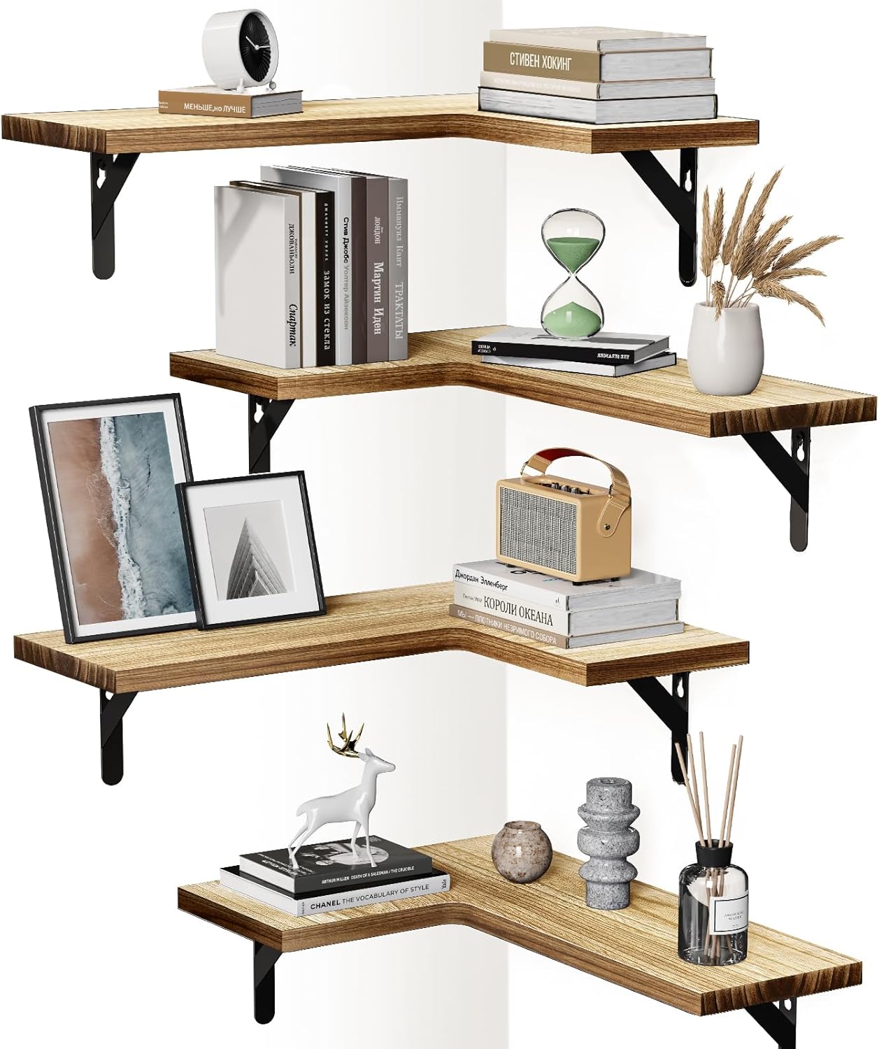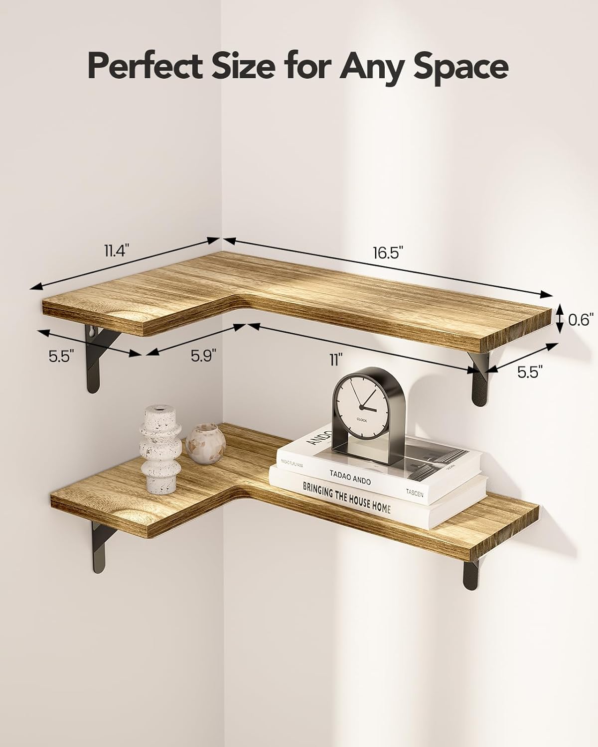 Complement Any Room: The natural wood grain of our corner shelf set can add a charming look that complements any decoration style. Whether you need to add wall shelves to your bedroom or utilize a corner in the living room, the attractive design will look great with any décor.