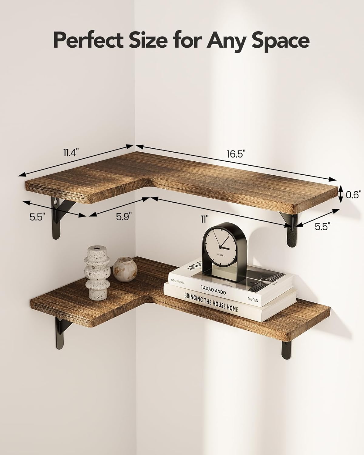 Maximize Corner Space: The Paulownia wood wall shelves feature an L-shaped design that fits perfectly in rooms with 90° corner walls. Free up more space by moving picture frames, spice bottles, or collectibles off furniture and up onto the wall for a cleaner look.
