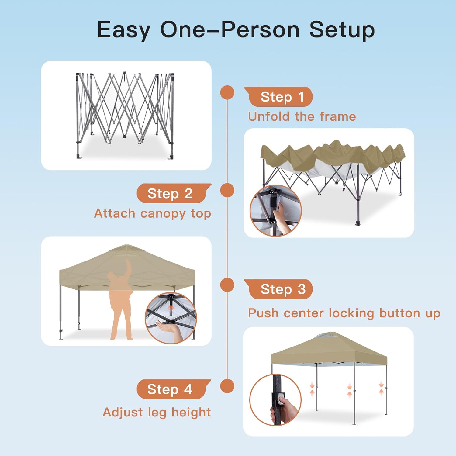 𝗢𝗻𝗲 𝗕𝘂𝘁𝘁𝗼𝗻 𝗤𝘂𝗶𝗰𝗸 & 𝗘𝗮𝘀𝘆 𝗦𝗲𝘁𝘂𝗽: AMADA 10x10 pop up canopy features patented one push center lock tech, just open the canopy, push the button, and adjust the height for instant shade in only a minute!This outdoor canopy for patio can be set up by one person without any tools. Three adjustable height settings with one central button and no-pinch height adjusters to allow easy setup and breakdown ensure convenience and safety.