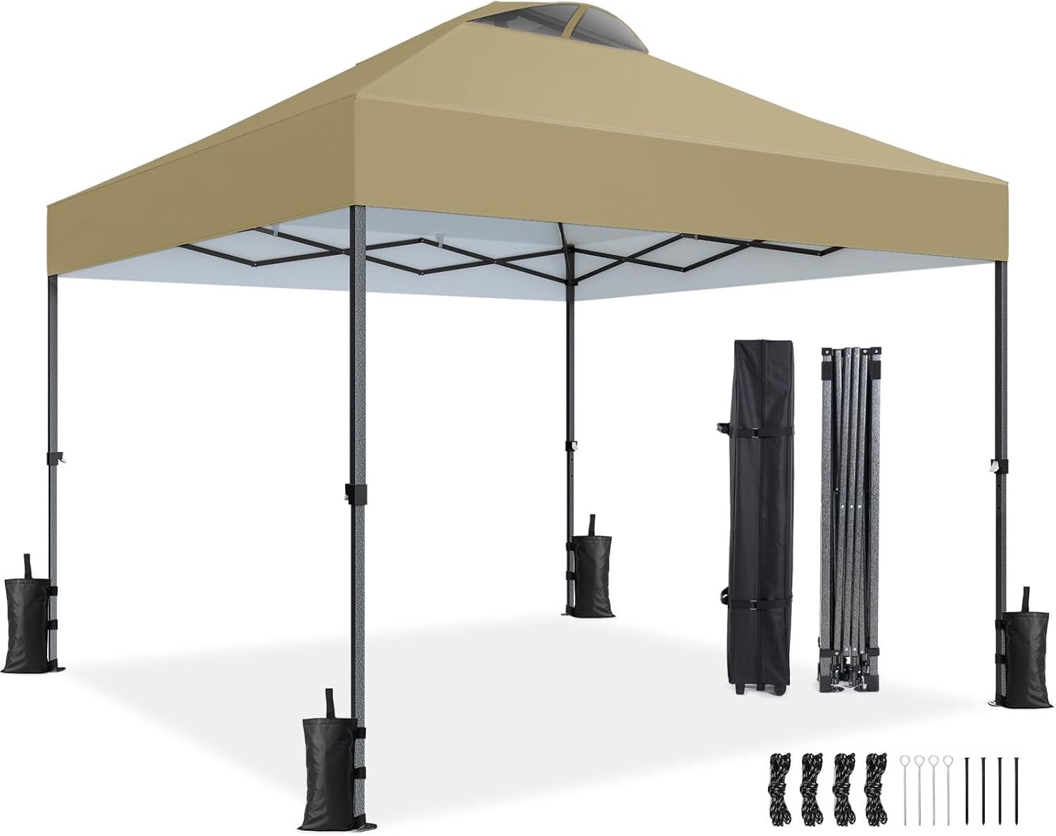 𝗦𝘁𝗮𝗯𝗹𝗲 & 𝗪𝗶𝗻𝗱-𝗥𝗲𝘀𝗶𝘀𝘁𝗮𝗻𝘁: Designed for reliability, this canopy tent stands strong in windy and rainy conditions. The vented top enhances airflow, reducing wind pressure, while the reinforced metal frame with sturdy corner brackets ensures superior stability. It includes 4 durable ropes, 8 ground stakes, and 4 sandbags , keeping your tent firmly anchored to the ground and provides reliable sunshade and rain protection making it the perfect shelter for any outdoor event!