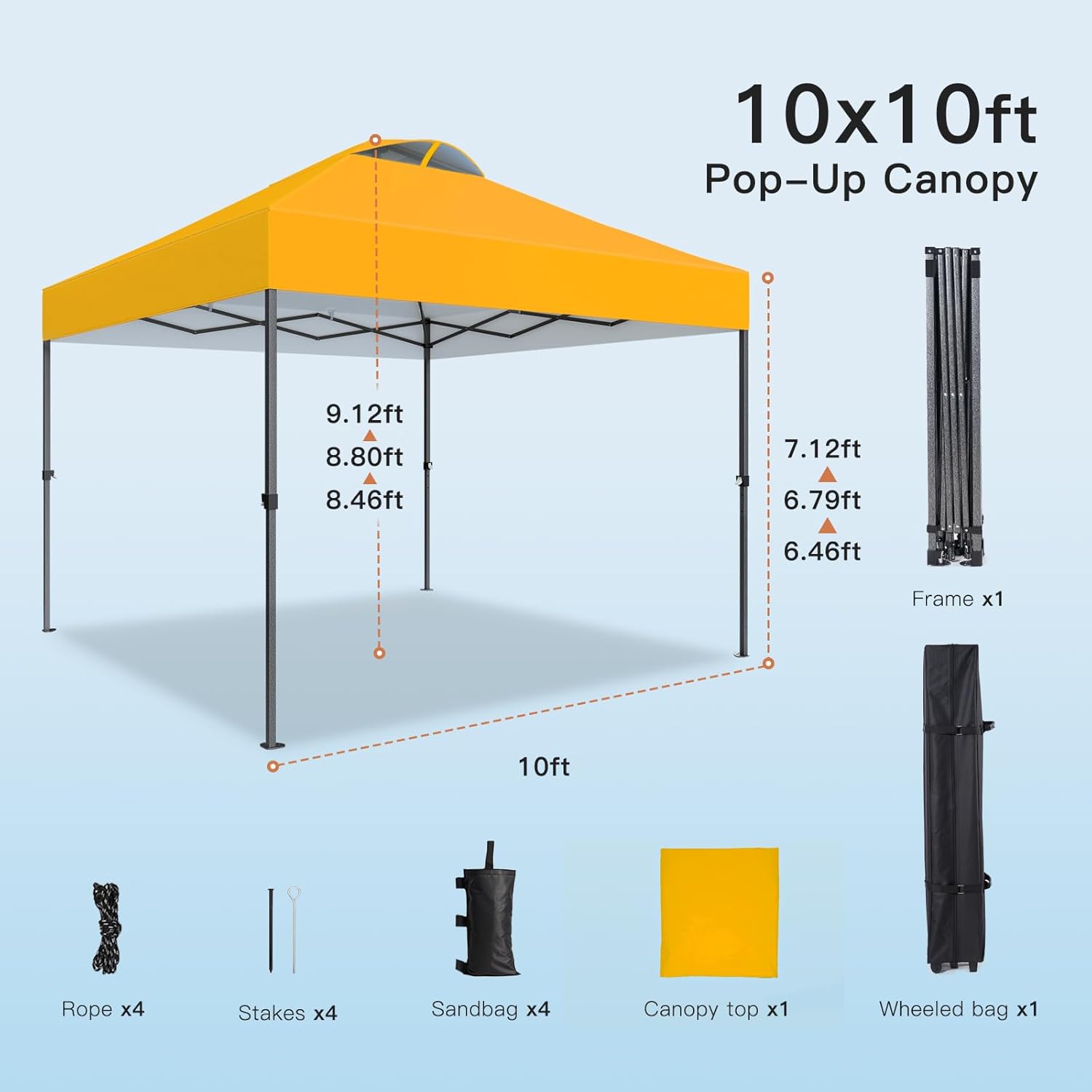 𝗦𝗽𝗮𝗰𝗶𝗼𝘂𝘀 & 𝗜𝗱𝗲𝗮𝗹 𝗦𝗵𝗮𝗱𝗲 𝗦𝗼𝗹𝘂𝘁𝗶𝗼𝗻: With a 10x10 pop up canopy footprint, this tent provides 100 square feet of shade, accommodating up to 10 people comfortably. The pop up canopy height can be adjusted in three levels according to needs: 8.46ft/8.80ft/9.12ft.TPerfect for outdoor fun like children's parties, or birthdays on any surface from the parking lot outside the stadium to the grass at the park.