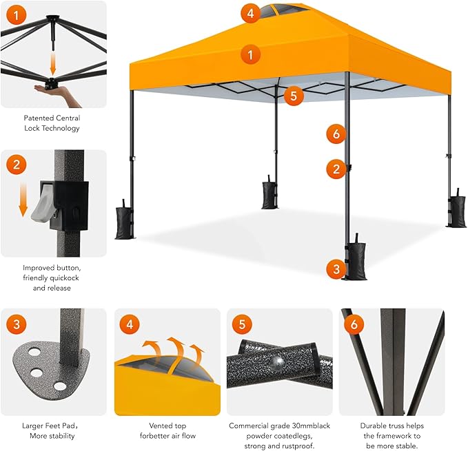 𝗢𝗻𝗲 𝗕𝘂𝘁𝘁𝗼𝗻 𝗤𝘂𝗶𝗰𝗸 & 𝗘𝗮𝘀𝘆 𝗦𝗲𝘁𝘂𝗽: AMADA 10x10 pop up canopy features patented one push center lock tech, just open the canopy, push the button, and adjust the height for instant shade in only a minute!This outdoor canopy for patio can be set up by one person without any tools. Three adjustable height settings with one central button and no-pinch height adjusters to allow easy setup and breakdown ensure convenience and safety.