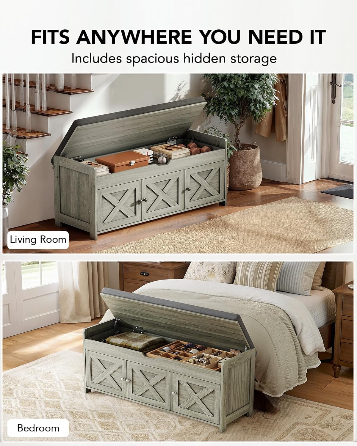 - 【Add Warmth and Style to Any Room】This charming farmhouse shoe storage bench combines strength wood and vintage metal accents to add warm, rustic character to any space. Perfectly versatile – use it as an entryway bench, bedroom bench, or living room footrest. Features hidden lift-top storage for shoes/blankets for baskets/decor. A stylish, practical solution that organizes your home with farmhouse flair