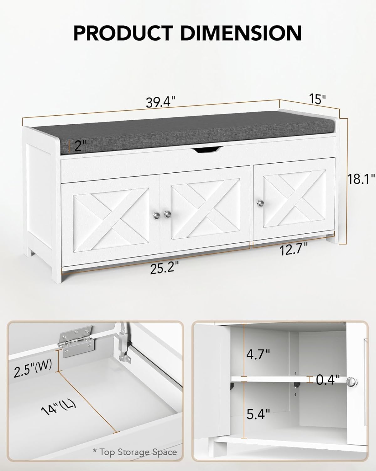 - 【Tailored Storage Bench That Fits Your Needs】Upgrade your entryway with this 16"-deep rustic shoe rack bench featuring three cabinet doors and two adjustable shelves (three height settings) for customizable storage. The extra-deep design effortlessly accommodates bulky boots, baskets, and men's size 13+ shoes, while the top-lid storage seat reveals hidden storage for blankets or seasonal items, with full-door coverage keeping all contents completely dust-free. – its compact 39.4"W x 18.1"H frame fits snugly in small spaces. Perfect for keeping shoes, accessories, and clutter neatly organized behind closed doors while adding rustic warmth to your home