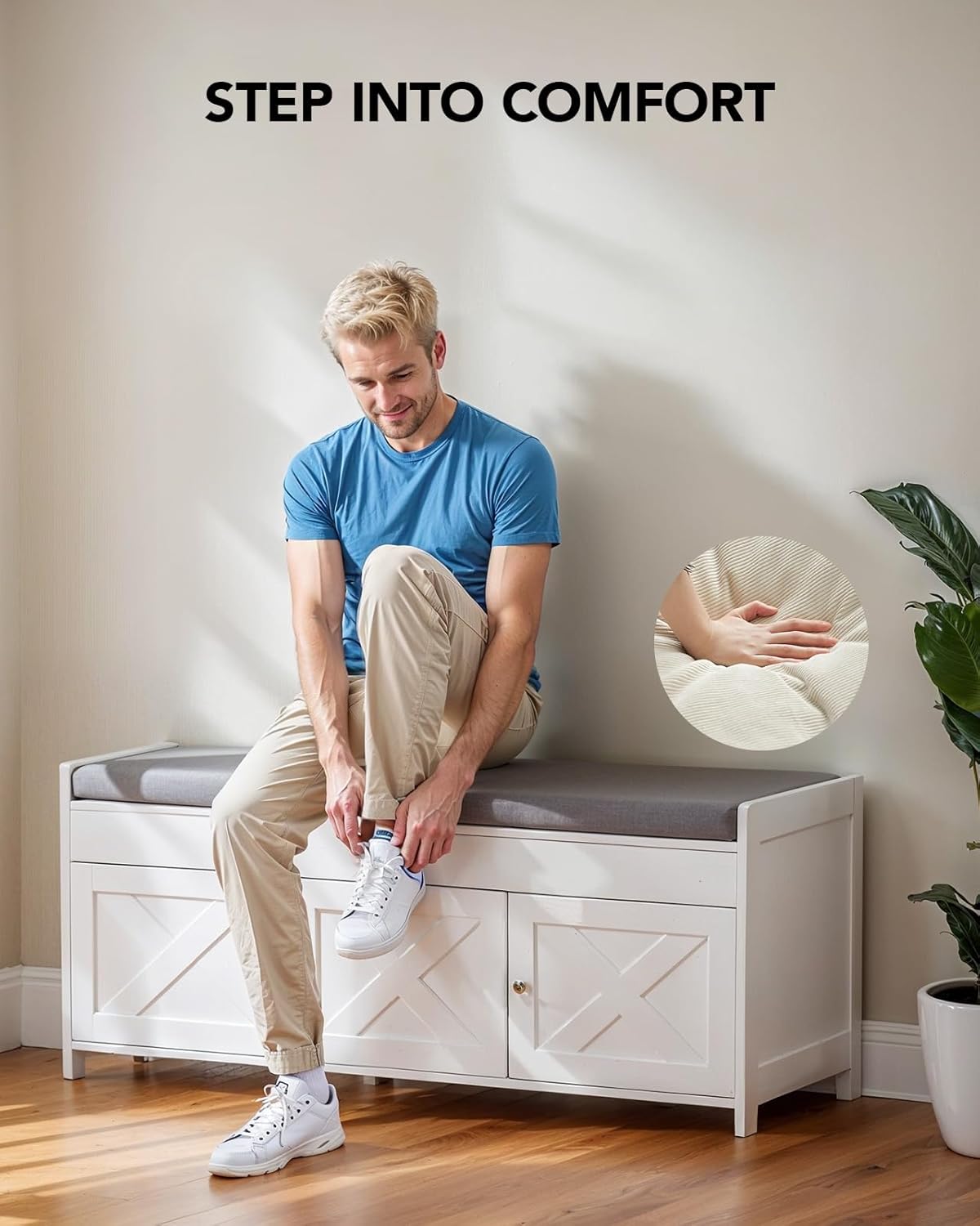- 【Plush Comfort Meets Ergonomic Design】 – Sink into the 2.3" thick high-resilience 25D foam cushion that delivers lasting support without sagging. With a generous 15" seat depth—far roomier than the common 13" on the market—it comfortably fits different body types and makes sitting noticeably more relaxing. The ideal 18" seat height means no awkward bending or straining, perfect for seniors and busy families. Upholstered in soft, easy-care fabric that feels inviting yet stands up to everyday wear. Whether placed by the entryway, at the foot of the bed, or styled as a cozy DIY under window bench seat, this storage bench combines cloud-like comfort with smart organization.